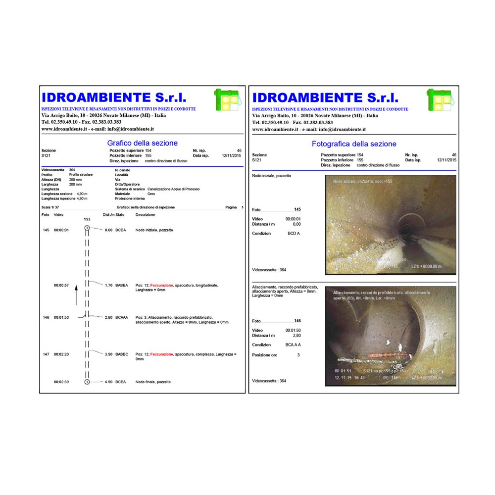 Ad intervento ultimato, viene rilasciata una documentazione su file delle condotte visionate: relazione comprensiva di osservazioni, grafici, immagini e video redatti dall’operatore con l’uso di programmi appositi conformi alla normativa.